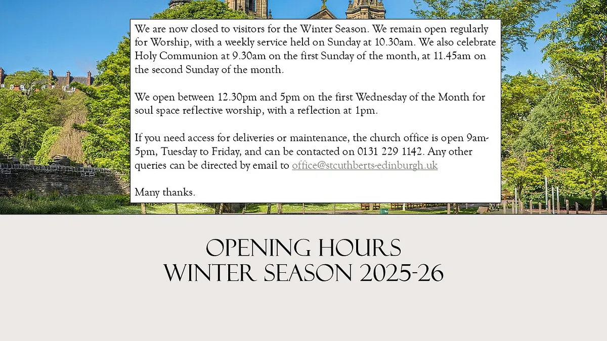 Please join us for our Sunday services - Our main act of worship is at 10.30am each Sunday, which includes a celebration of Holy Communion on the last Sunday of the month. Additionally, we have services of Holy Communion in the Memorial Chapel at 9.30am on the first Sunday of the month; immediately after the service on the second Sunday of the month; and at 12noon on the first Tuesday of the month.